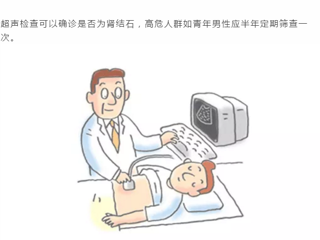 超聲檢查可以確診是否為腎結(jié)石,高危人群如青年男性應(yīng)半年定期篩查一次。
